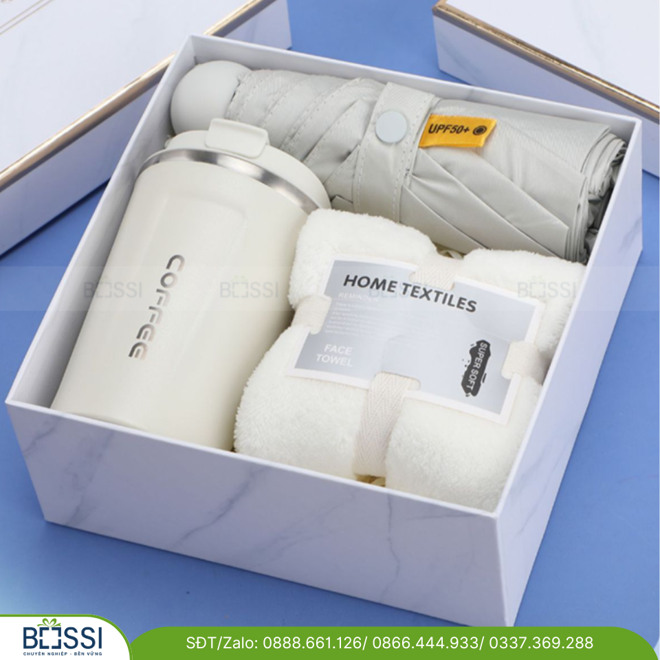 Đáp ứng nhu cầu về một bộ quà tặng đa năng lại thiết thực, Bossi có Giftset 3 sản phẩm Ô + khăn + bình giữ nhiệt. Bộ quà tặng gồm 3 sản phẩm: