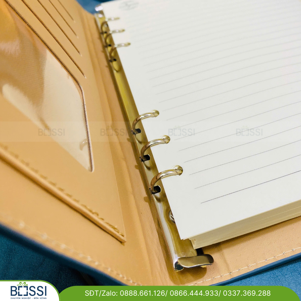 + Kiểu dáng: Sổ da A5, gáy còng có thể thay ruột sổ dễ dàng, mặt trong bìa sổ có các ngăn cài thẻ, namecard