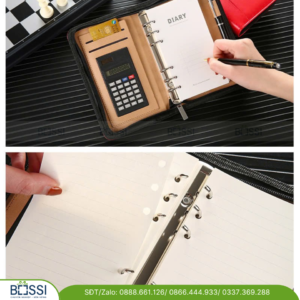 + Kiểu dáng: Sổ da A6, gáy còng có thể thay ruột sổ dễ dàng, mặt trong bìa sổ có các ngăn cài thẻ, namecard