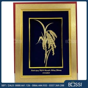 - Bức tranh họa tiết cây lúa: Từ lâu bông lúa là biểu tượng cao quý của người Việt Nam bởi lúa nước đã đồng hành cùng cuộc sống và nuôi lớn bao thế hệ người dân nước ta. Theo đó, bức tranh bông lúa chín vàng uốn câu mạ vàng thể hiện lòng biết ơn cũng như lời chúc mừng cho thành công bội thu của doanh nghiệp.