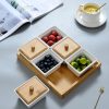 Bộ đĩa sứ đựng hoa quả bánh kẹo mứt Tết này có kết cấu đặc biệt, vừa gọn ghẽ vừa sang trọng, phô bày được đầy đủ vẻ đẹp của đồ ăn. Ngoài ra còn có khay gỗ tre tiện dụng để bạn có thể trữ dĩa, thìa… rất gọn gàng và sạch sẽ.
