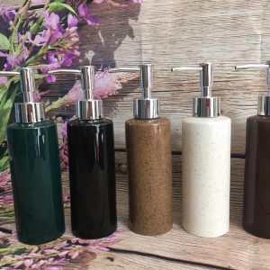 – Bộ đồ dùng nhà tắm phong cách tối giản gồm các sản phẩm: chai đựng sữa tắm, nước rửa tay, dầu gội…