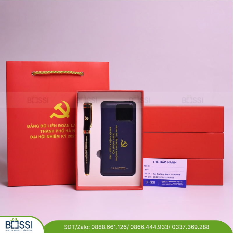 Bộ Giftset Sạc dự phòng + Bút ký logo Đảng bộ LĐ Lao động là món quà văn phòng được nhiều tổ chức, doanh nghiệp và cá nhân quan tâm lựa chọn cho các sự kiện đặc biệt. Thiết kế đơn giản nhưng mang ý nghĩa tốt đẹp dành cho người nhận, hứa hẹn là món quà được nhiều người trân trọng. Bạn hãy cùng Bossi khám phá món quà này nhé!