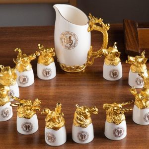 Bộ ly rượu thể hiện 12 con cung hoàng đạo tý – sửu – dần – mão – thìn – tỵ – ngọ- mùi – thân – dậu – tuất – hợi. Sản phẩm có đầy đủ 12 ly rượu và một bình rót rượu mỗi khi sử dụng. Khi dùng xong gia chủ có thể sử dụng trưng bày làm đồ trang trí kệ, tủ rượu hay để bàn đều rất ấn tượng.