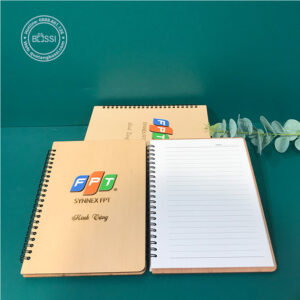 - Kiểu dáng: sổ tay A5, gáy xoắn, khắc lazer logo, cắt CNC theo yêu cầu