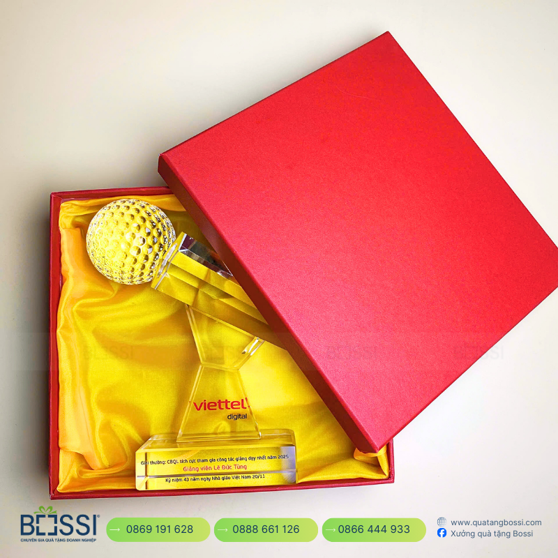 - Kích thước: Kích thước 18 × 20 × 5 cm, cân đối, chắc tay, phù hợp trưng bày tại bàn làm việc, tủ kính hoặc sân khấu vinh danh.