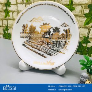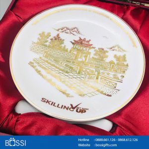 Đĩa trang trí vẽ vàng cảnh Văn Miếu, đĩa sứ vẽ vàng logo SkillingUP – Tổng cục dạy nghề