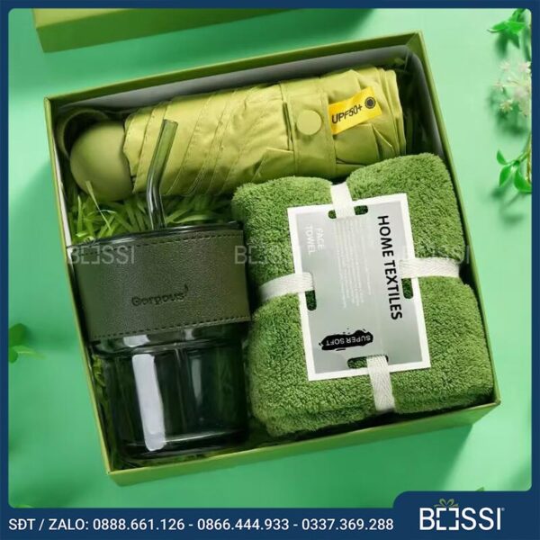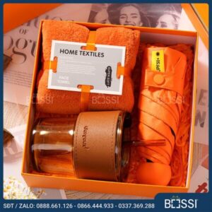 Đáp ứng nhu cầu về một bộ quà tặng đa năng lại thiết thực, Bossi có Giftset 3 sản phẩm Ô + khăn + cốc. Bộ quà tặng gồm 3 sản phẩm: