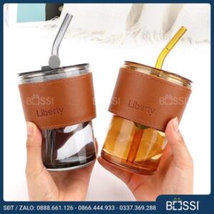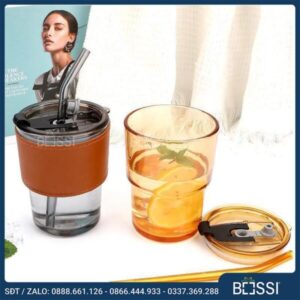 Cốc thủy tinh bọc da có dung tích 350ml, cầm vừa tay, an toàn cho người sử dụng. Cốc có màu xám khói hoặc cam. Ống hút bằng thủy tinh cùng màu. Nắp bằng nhựa cứng có gioăng cao su và silicone chống tràn trong quá trình di chuyển. Phần tay cầm bằng da cách nhiệt tốt, phù hợp sử dụng thức uống nóng/ lạnh. Cốc thiết kế chắc chắn, kiểu dáng hiện đại, cầm vừa vừa tay.
