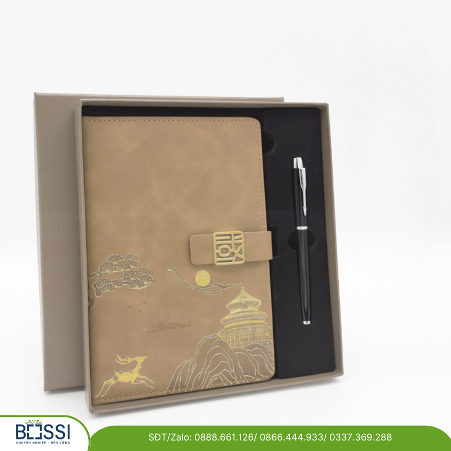 - Bộ quà tặng gồm sổ và bút được đặt trong hộp giấy cùng màu, kết hợp với họa tiết mạ vàng tinh tế đem lại cảm giác sang trọng, lịch sự hiếm có. Các màu sắc để bạn lựa chọn: ghi xám đậm, đỏ, xanh lục bảo, nâu đất, nâu nhạt, dễ dàng kết hợp với nhiều thương hiệu.