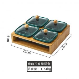 Khay mứt Tết sứ khung gỗ 4 hũ (nắp thủy tinh) – Xanh là vật không thể thiếu trong tục tiếp khách của người Việt Nam những ngày Tết. Ngày nay với sự phát tiển đa dạng cả về hình dáng, màu sắc thiết kế, hộp đựng mứt tết không chỉ đơn giản để kẹo bánh tiếp khách mà còn thể hiện con mắt tinh tế của gia chủ, là một vật dụng trang trí vật trang trí cho không gian thêm sang trọng và ấm cúng.