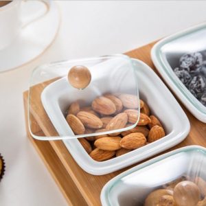 Đặc điểm của Khay mứt Tết sứ khung gỗ 4 hũ (nắp thủy tinh) – Trắng: