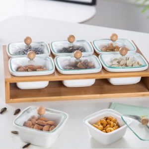 Khay mứt Tết sứ khung gỗ 6 hũ (nắp thủy tinh) – Trắng là vật không thể thiếu trong tục tiếp khách của người Việt Nam những ngày Tết. Ngày nay với sự phát tiển đa dạng cả về hình dáng, màu sắc thiết kế, hộp đựng mứt tết không chỉ đơn giản để kẹo bánh tiếp khách mà còn thể hiện con mắt tinh tế của gia chủ, là một vật dụng trang trí vật trang trí cho không gian thêm sang trọng và ấm cúng.