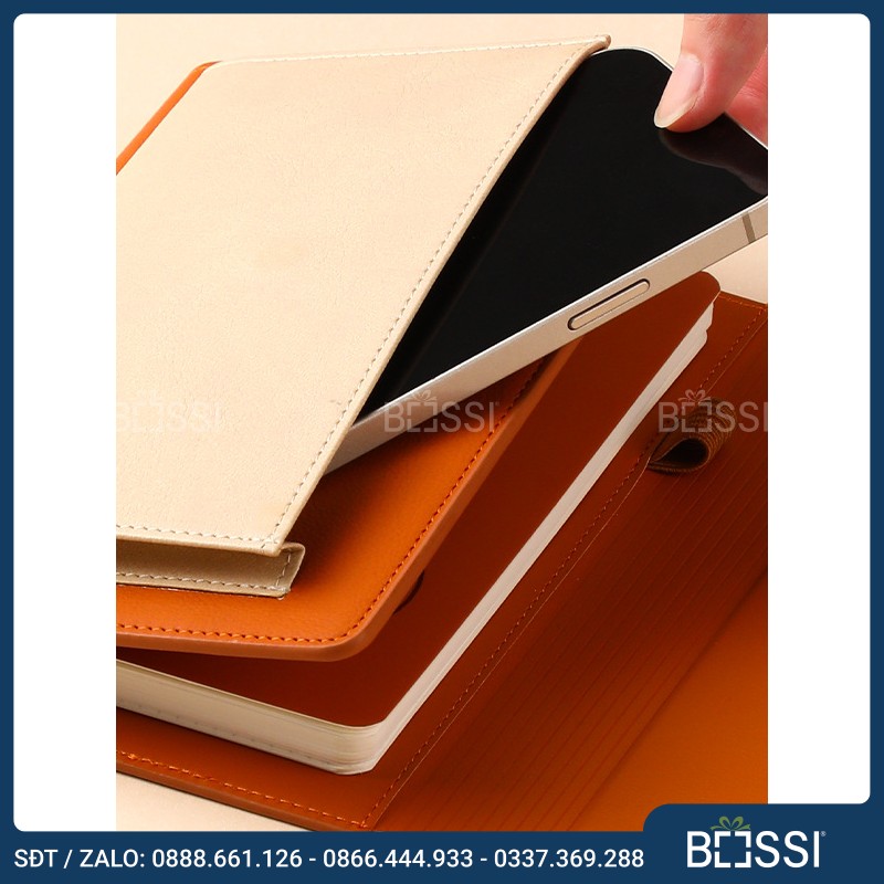 Tại cuốn sổ này có 2 chiếc ví: chiếc ví lớn bên ngoài và ví cài bên trong. Ví lớn bên ngoài có thể để vừa một số vật dụng: như điện thoại, bút,… Ví bên trong dạng cài chuyên dùng cho các giấy tờ nhỏ nhưng quan trọng.
