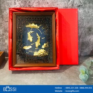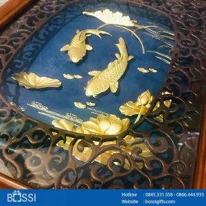 Tranh được chế tác tinh xảo, đẹp mắt là minh chứng cho vẻ đẹp thanh khiết, thoát tục của loài hoa sen kèm hình ảnh những con cá chép uốn lượn mang trong mình cả một sứ mệnh đặc biệt – Tranh cá chép sen mạ vàng 24k TMV02 FPT software.
